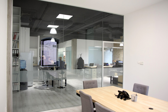 Budapest, distrito IX. el barrio „Ferencváros”. En un edificio que originalmente fue un molino y almacén de trigo, convirtieron las plantas superiores de una altura interior considerable en viviendas loft con una intervención estructural de mucha envergadura. Mi deber fue crear un espacio de 200 m2 para un bufete de abogados en la esquina noroeste del edificio, en la planta baja. Entre los muros de carga originales de ladrillo visto y las estructuras de soporte de hormigón armado, también descubiertos, hemos introducido tabiques de vidrio para dotar de luz las areas interiores. El resultado es un espacio de trabajo agradable.