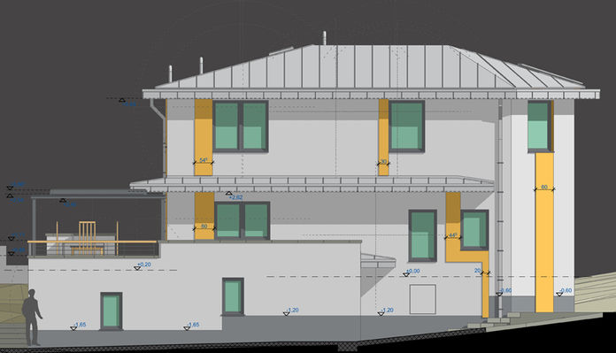 Budaörs Kamaraerdő részén, egy rég kialakult beépítettségű és magas zöldfelületi értékkel rendelkező területen terveztük a terebélyes, de elég racionális térszervezésű, háromszintes lakóházat a kis gyerekeket nevelő fiatal család számára. A nagyon jó adottságokkal rendelkező telken egy meglévő épület felhasználásával sikerült az építési helyen kívüli pozíciót megőrizni, vagyis a házat a magánút felőli telekhatár mellett fejleszteni, így kialakítva a mindössze 800 m2 telken az egybefüggő kb. 500 m2 kertet. A ház a kb. 2 évig tartó kivitelezés közben számtalan probléma hősies leküzdése után, végül 2024 tavaszára készült el.
