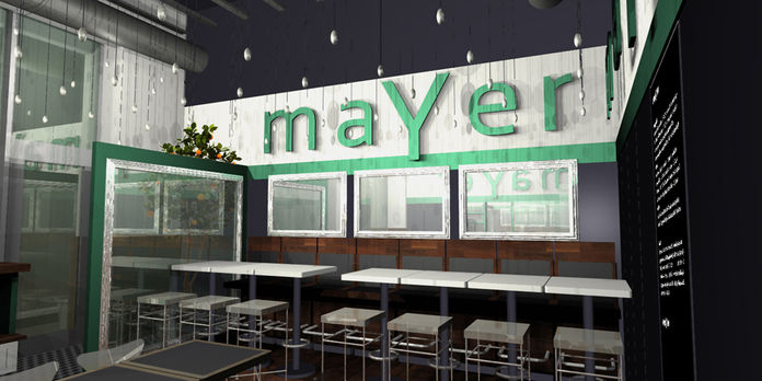 A maYer bistro az Október 6. utcában, a Szabadság tér torkolatánál egy viszonylag kicsi és alapvetően a reggeli és az ebéd kiszolgálásra koncentráló „sűrű” hely. Finom ételek, belvárosi pörgés, esti üldögélés borokkal, kávékkal. Két hatalmas üvegezett portál mögött található a fogyasztótér, amit középen egy bisztróasztalos és egy pultos kiszolgáló részre oszt a galériára vezető lépcső. A szükséges konyhai funkciók, a személyzeti és a vendégeket kiszolgáló másodlagos terek a fogyasztó tér kubusán kívül, rejtett pozíciókban, „a falon túl” kerültek elhelyezésre. A kivitelezés a koncepcióterv alapján történt, annak kissé redukált, egyszerűsített megoldásaival, a részletek kidolgozása nélkül, ami a hely hangulatának nem tesz jót. A koncepciótervhez képest sűríteni, finomítani kellett volna a design-t, ennek ellenére vállalható a végeredmény. A hely 2018-ban bezárt.